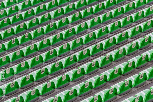 Fototapeta premium diagonal lines of rows of green plastic seats inside a soccer stadium