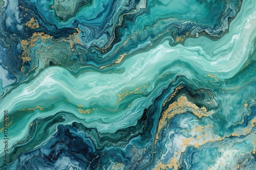 © AkuAku, Naklejka premium Diagonal mint green waves with golden specks. Fluid artistic design. Abstract marble texture or backdrop.