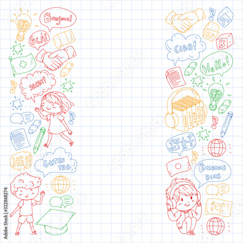 © rudut2015, Fototapeta premium Dialog clouds with HELLO Vector pattern for language class, online courses. English, arabic, italian, japanese, spanish, chinese, german.
