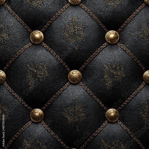 © Bintang, Obraz premium Diamond-patterned black tufted leather with golden buttons and ornate details