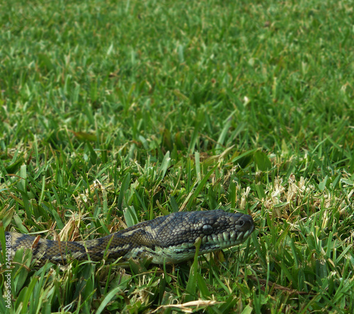 Fototapeta premium Diamond python slithering through the grass in a backyard of Australia
