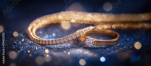 Fototapeta premium Diamond ring, bracelet on glitter, bokeh