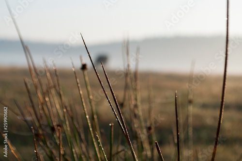 Obraz premium Diamonds of morning forest. Dew on the yellow grass in the meadow. Background