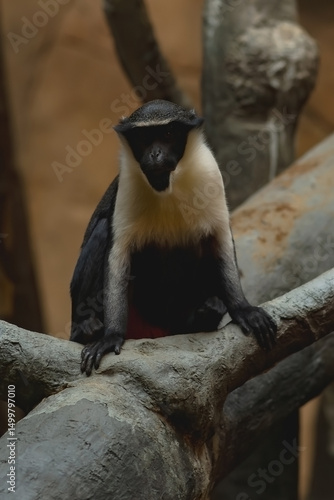 Obraz premium Diana monkey sitting on a tree branch in a dark room and looking at the camera