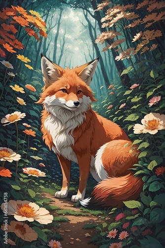 Fototapeta premium dibujo de un zorro rodeado de flores