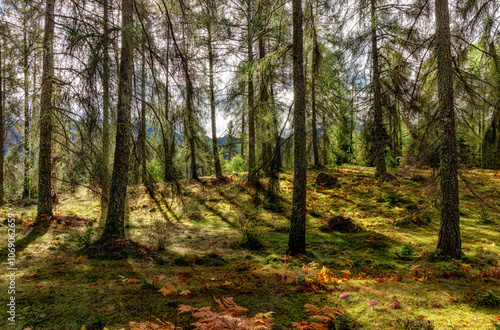 © tom-pic-art, Fototapeta premium Dichter idyllischer Lärchenwald,tiefe Sonne,lange Schatten im Moos