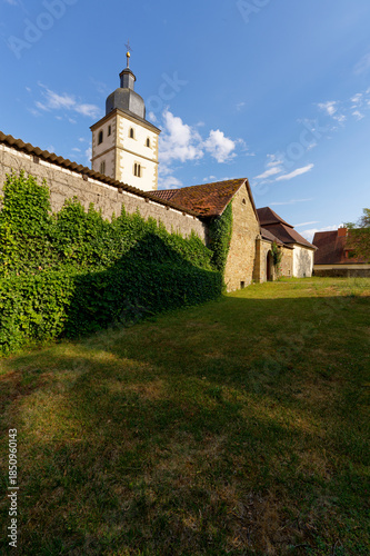 © dina, Naklejka premium Die historische Kirchenburg St. Cosmas und Damian in Euerbach, Landkreis Schweinfurt, Unterfranken, Bayern, Deutschland