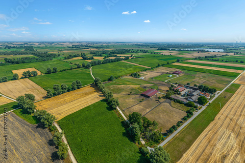Naklejka premium Die Kulturlandschaft im schwäbischen Donauried bei Leipheim im Luftbild