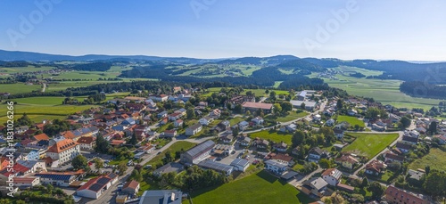 © ARochau, Obraz premium Die Marktgemeinde Wegscheid im Passauer Land im südlichen Bayerischen Wald von oben