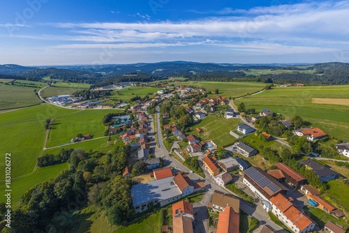 © ARochau, Fototapeta premium Die Marktgemeinde Wegscheid im Passauer Land im südlichen Bayerischen Wald von oben