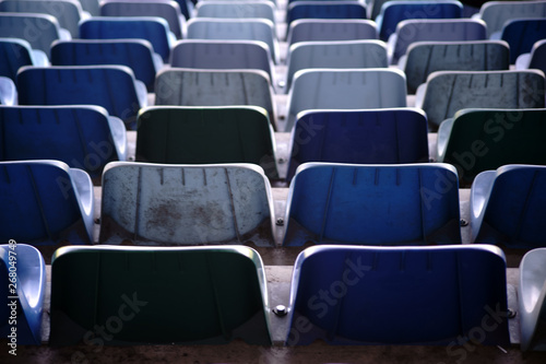 Fototapeta premium Die Rückansicht auf die Lehnen und Sitzplätze von Sitzreihen in einem Stadion...