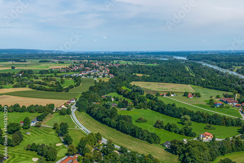 © ARochau, Fototapeta premium Die Region Niedergern bei Piesing in Oberbayern aus der Vogelperspektive