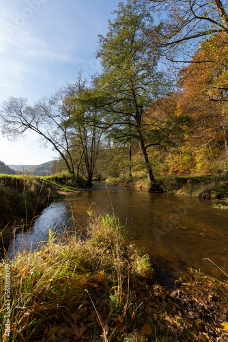 Fototapeta premium Die Schondra im Naturschutzgebiet Unteres Schondratal, zwischen der Gemeinde...