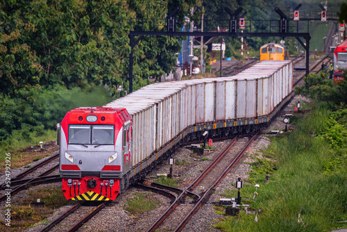 © Teppakorn, Fototapeta premium Diesel locomotive towing a gray container.