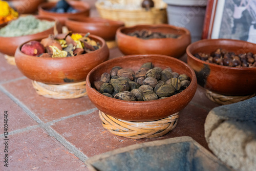 Fototapeta premium Diferentes insumos para teñir lana de forma artesanal en Teotitlan Oaxaca, méxico