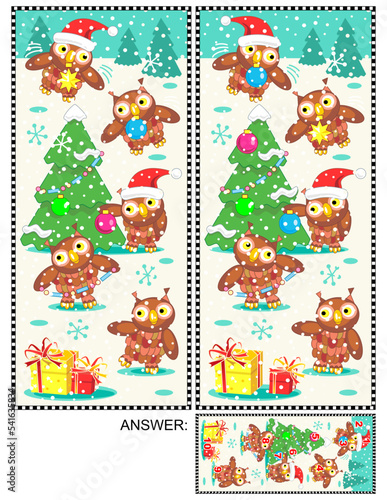 Fototapeta premium Difference game with owls decorating fir tree for winter holidays. Answer...