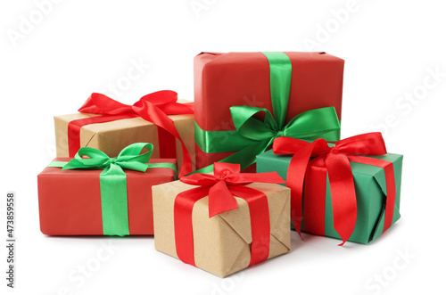 Obraz premium Different beautifully wrapped gift boxes on white background
