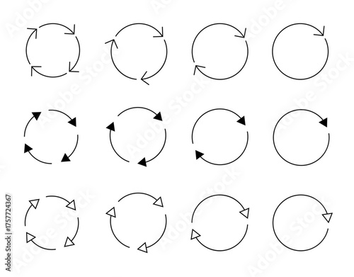 Fototapeta premium Different circular arrows of black color, different thickness and size. Vector