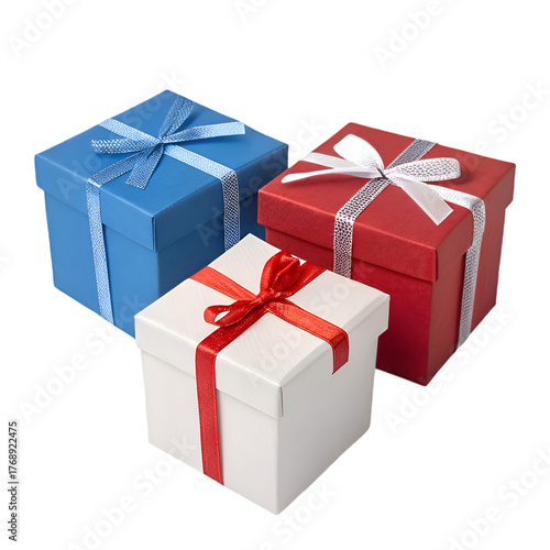 © Amna, Fototapeta premium 3 different colors gift boxes blue red and white isolated on transparent background