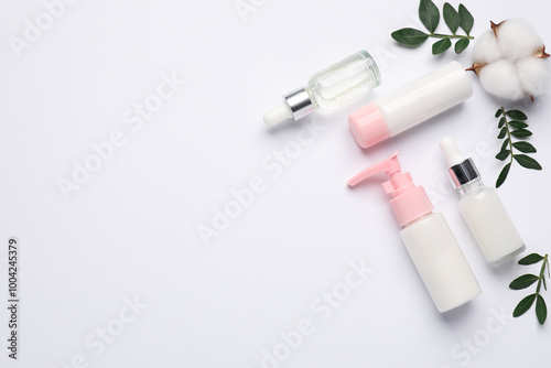 © New Africa, Naklejka premium Different cosmetic products, cotton flower and leaves on white background, flat lay. Space for text