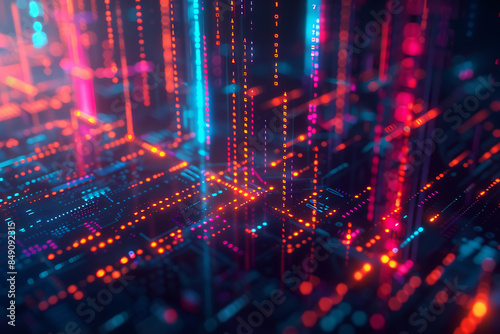 Fototapeta premium different cryptocurrency coins against a tech binary abstract background, combining digital currency symbols with streams of binary code, showcasing the intersection of technology and finance