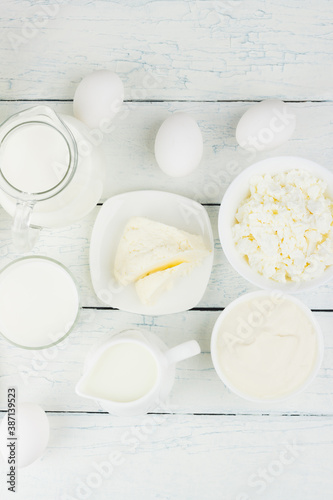 © lisssbetha, Fototapeta premium Different dairy products on the white wooden boards