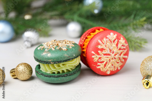 © New Africa, Obraz premium Different decorated Christmas macarons and festive decor on white wooden table, closeup