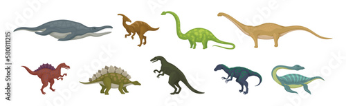 Obraz premium Different Dinosaurs as Terrestrial Reptiles of Jurassic Period Vector Set