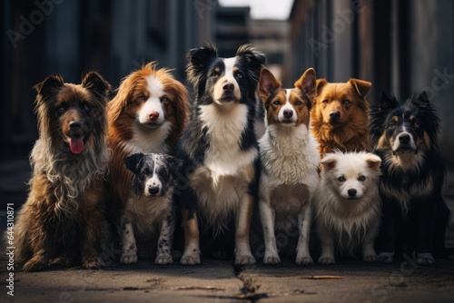 Obraz premium Different dogs sit separately and look at the camera. Pets