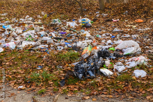 © ihorbondarenko, Obraz premium Different garbage on a ground in forest
