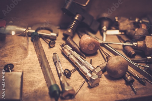 Fototapeta premium Different goldsmiths tools on the goldsmith workplace.