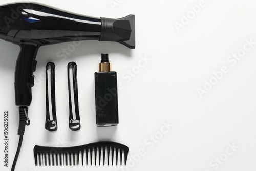 Naklejka premium Different hairstyling tools on white background, flat lay. Space for text