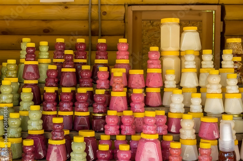 © Евгений Медведев, Fototapeta premium different honey in plastic cans stands on a wooden counter in the room