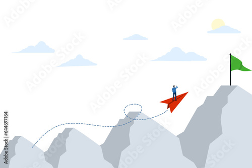 © FAHMI , Naklejka premium different leadership concepts. A businessman travels on a red paper plane towards a green flag. Leadership in business to achieve success. flat business vector illustration on white background.