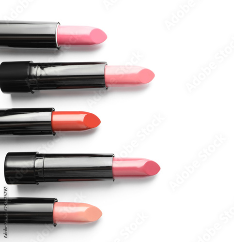 © New Africa, Obraz premium Different lipsticks on white background, top view