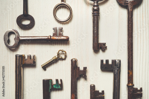 © tartalja, Obraz premium Different old fashioned keys on a white table