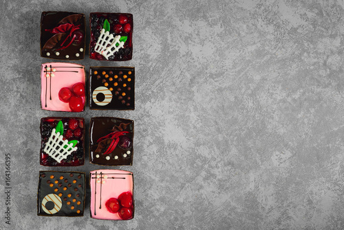 © fserega, Fototapeta premium Different pastries tasty assortment. Dessert tray assorted top view background. Cakes, bright, colorful pastry sweets with fresh berries. French Bakery pattern. Flat lay. Blank space.