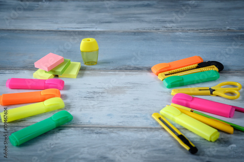 © barbiturat, Naklejka premium Different pens pencils markers clean notebook and other stationery on the blue vintage wood background copy space