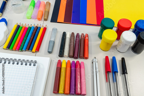 © RomanR, Fototapeta premium different school supplies on white desk background. Back to school concept. Flat lay composition