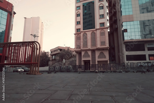 © Afia, Fototapeta premium different style roadside buildings, surrounded by fences and some pigeons.