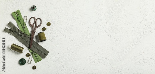 © Pixel-Shot, Obraz premium Different tailor's supplies with measuring tape on white grunge background with space for text