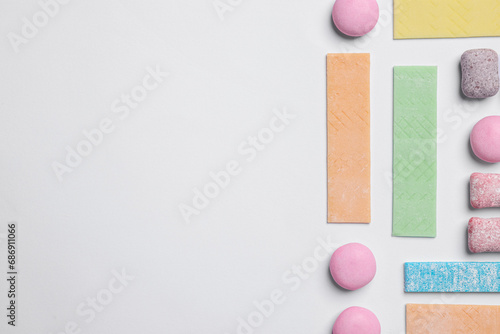 Fototapeta premium Different tasty colorful bubble gums on white background, flat lay. Space for text