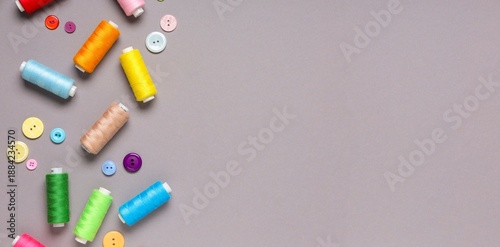 © Pixel-Shot, Naklejka premium Different thread spools and buttons on grey background with space for text