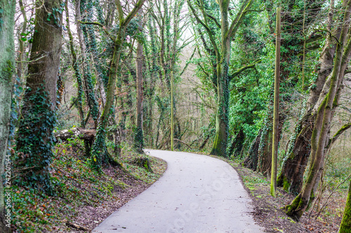 Obraz premium different trees stand without foliage along the small path in the forest