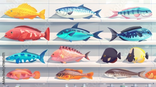 © Irina, Naklejka premium Different type of fish seafood on supermarket shelfs wallpaper background