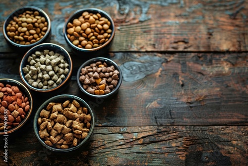 © VolumeThings, Fototapeta premium Different types of cat food including dry and wet options displayed on wooden background with space for text