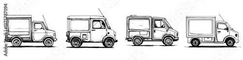 © neiros, Fototapeta premium Different types of delivery trucks lined up showing various sizes and designs on a white background