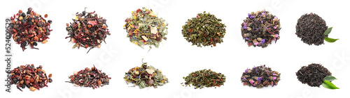 © Pixel-Shot, Fototapeta premium Different types of dry tea on white background