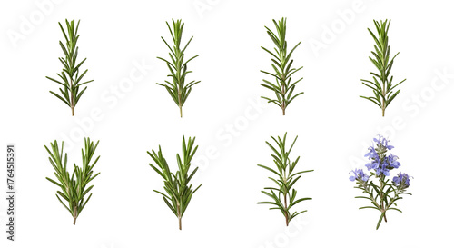 © top success, Naklejka premium Different types of fresh rosemary sprigs with one flowering rosemary plant isolated on white background, perfect for culinary and herbal usage
