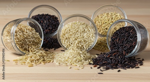 Fototapeta premium Different Types of Rice Displayed in Small Glass Bowls on Table